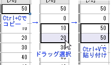 ①コピーしたい選択し、[Ctrl]+[C]キーでセルをコピーします。