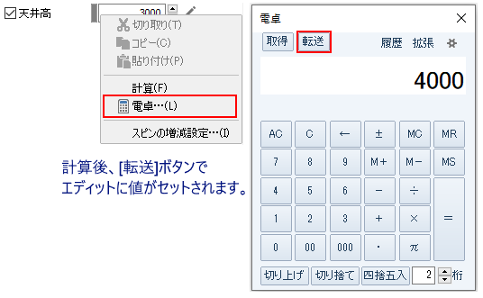右クリックメニューから電卓が実行でき、電卓からの数値取得ができます。