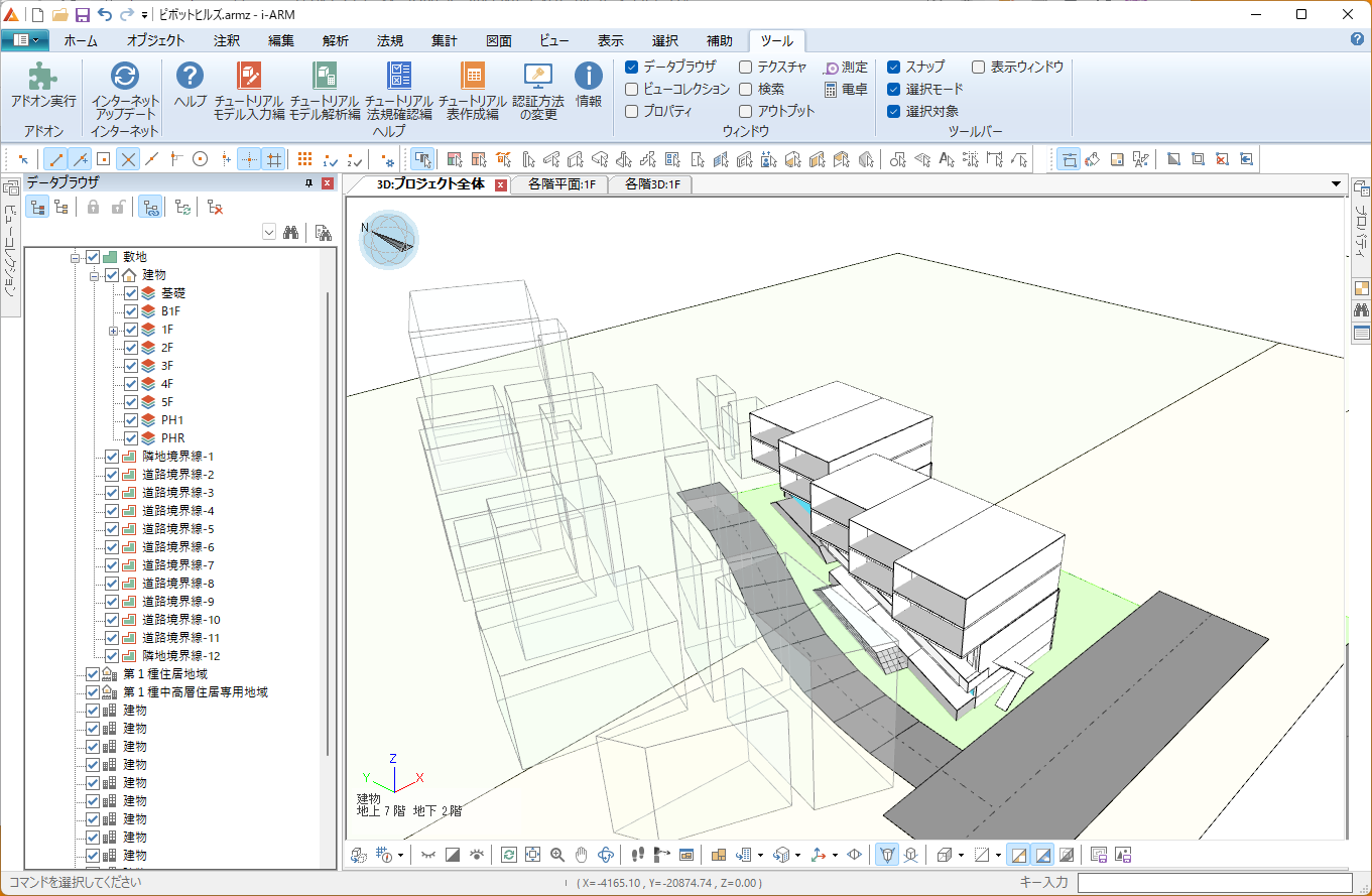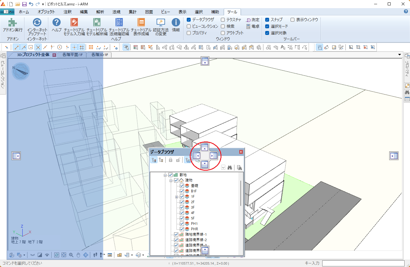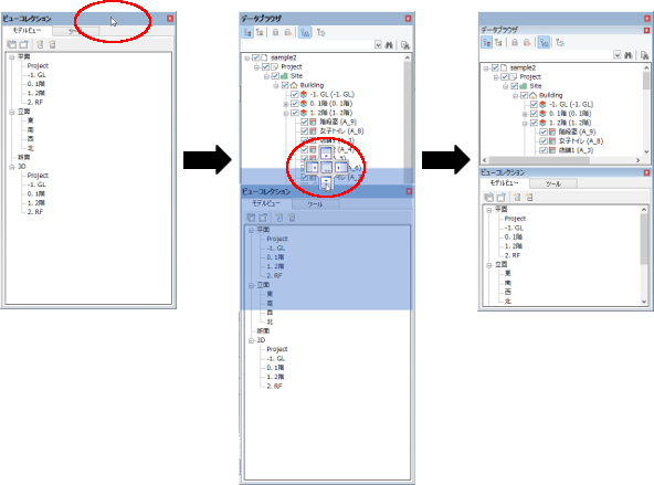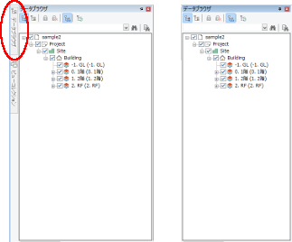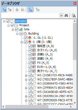 データブラウザモデルデータをツリー構造で表示します。ツリー上のオブジェクトを選択すると、 ビューでハイライト表示され、表示属性などを変更できます。 |