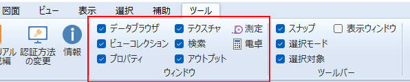 リボンメニューの[ツール]カテゴリーの[ウィンドウ]パネルから表示したいウィンドウのチェックボックスをクリックして表示を切り替えます。