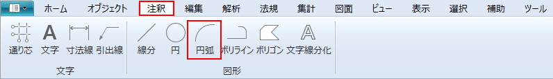 中心、始点、終点を指示して、設定した半径の円弧を入力します。
