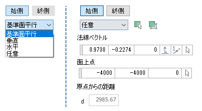 端部を「基準面平行」「垂直」「水平」「任意」から選択します。