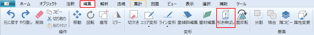 要素を引き伸ばしたり、引き伸ばし形状の高さ/奥行きや引き伸ばし方向、端部のカット面などの編集を行います。