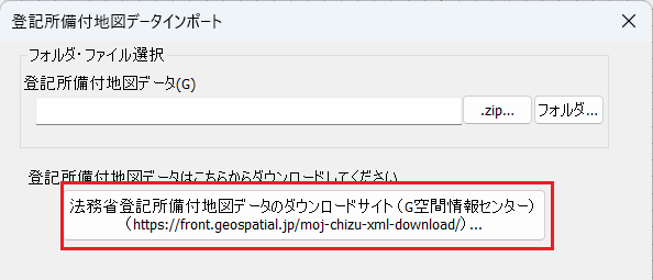 ダイアログ中央の「法務省登記所備付地図データのダウンロードサイト(G空間情報センター)」ボタンをクリックします。
