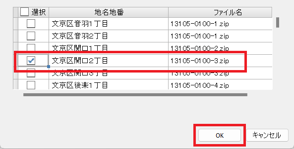 対象の地名地番にチェックをいれ「OK」ボタンでインポートを開始します。
