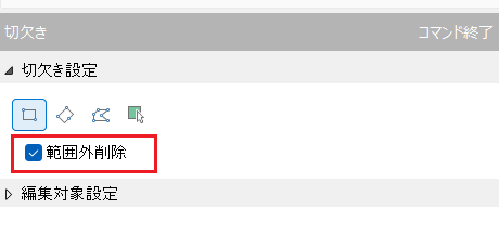 「切り欠き」コマンドダイアログで、「範囲外削除」にチェックをいれます。