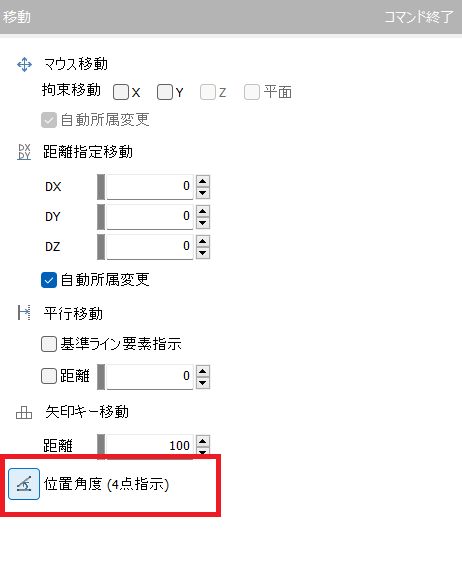 「移動」コマンドダイアログの「位置角度(4点指示)」モードを選択します。