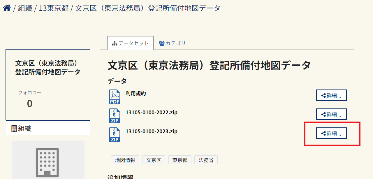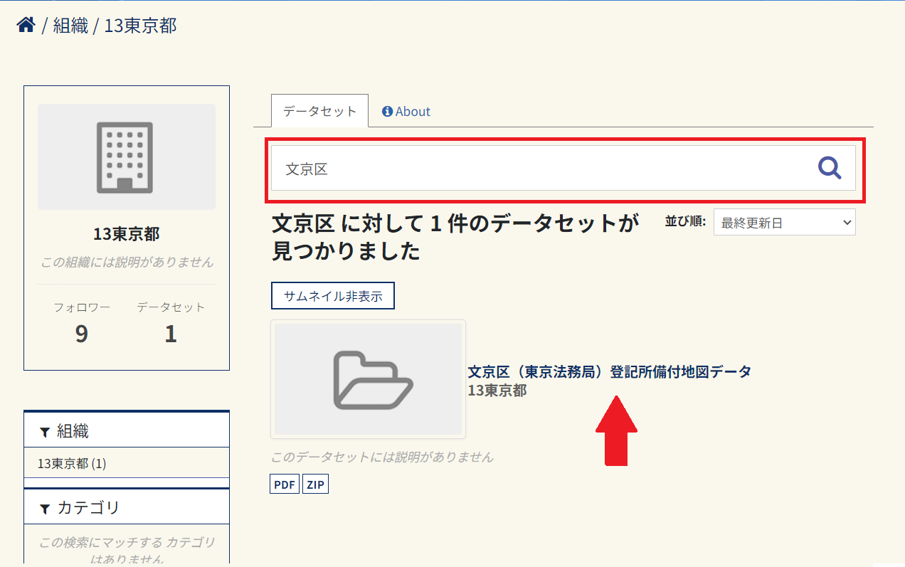 データセットの検索欄で市区町村名を検索し、目的の市区町村の登記所備付地図データを選択します。