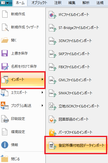 ファイルメニュー→[インポート]→[登記所備付地図のインポート]
