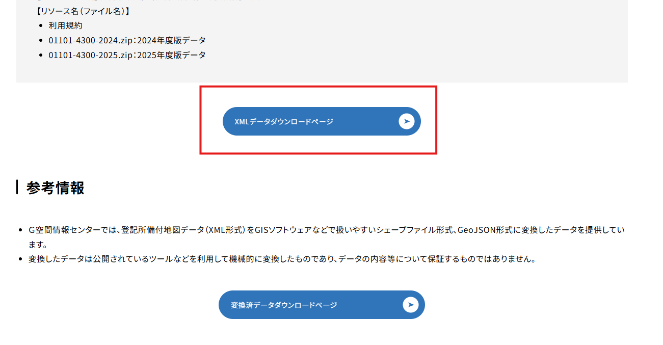 ページ下部の「XMLデータダウンロードページ」ボタンをクリックし、ダウンロードページに移動します。