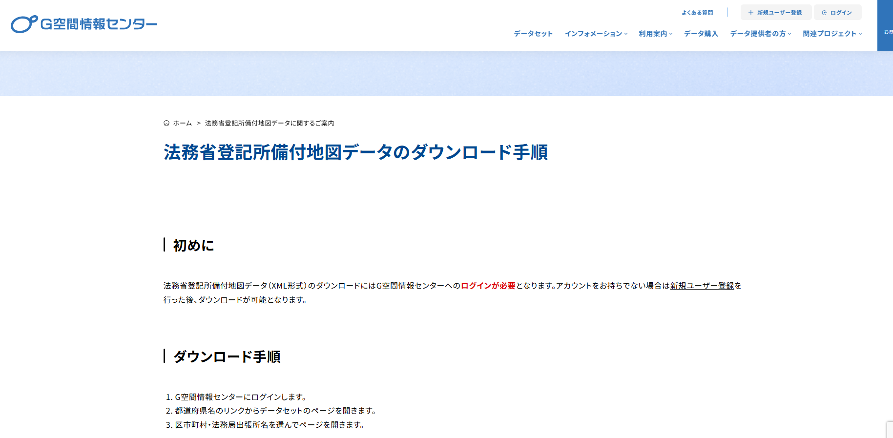 「法務省登記所備付地図データダウンロード手順」をお読みいただき、ユーザー登録していない場合は新規ユーザー登録を行ってください。