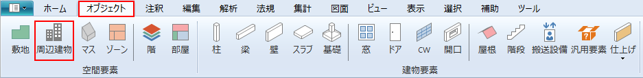 リボンメニュー[オブジェクト]→[周辺建物]