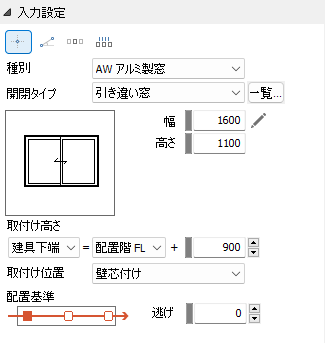 窓の上端/下端のどちらかを設定し、その上端/下端レベルを高さ基準の選択と取り付け高さ(mm)で設定します。
