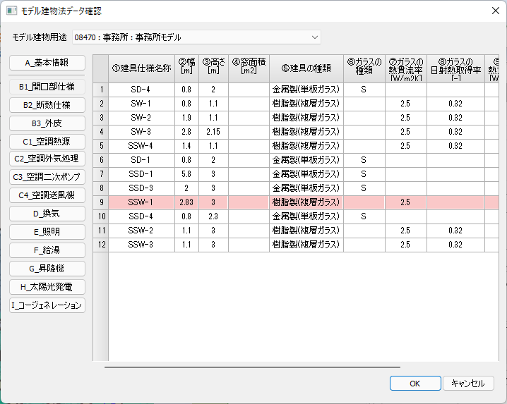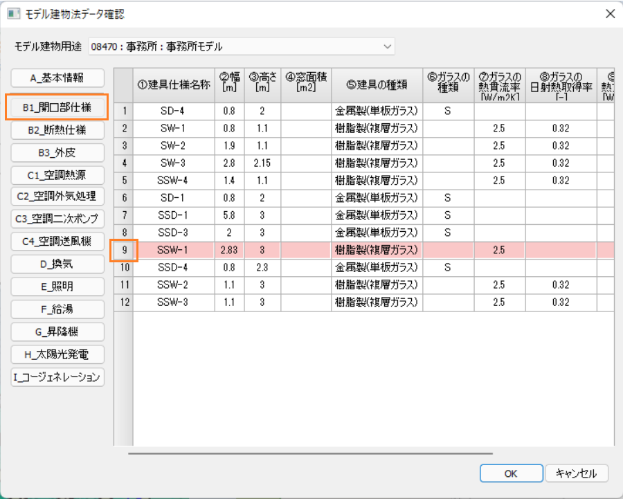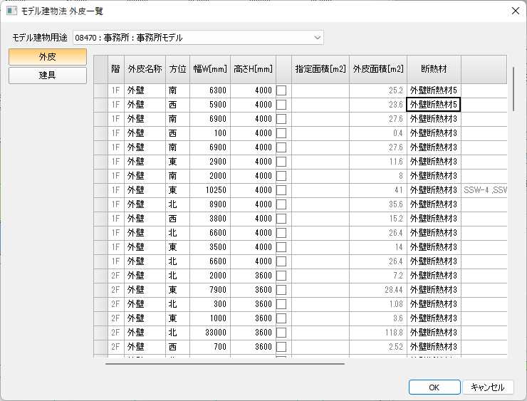 モデル建物法の外皮となる部分とその外皮に所属する開口の一覧です。開口はB1、断熱材はB2でそれぞれ設定した名称を元に表します。 |