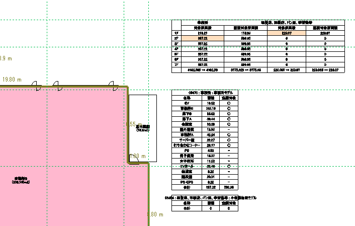 床面積最大の階に外周長さ、非空調コア長さの根拠式を示します。 |
