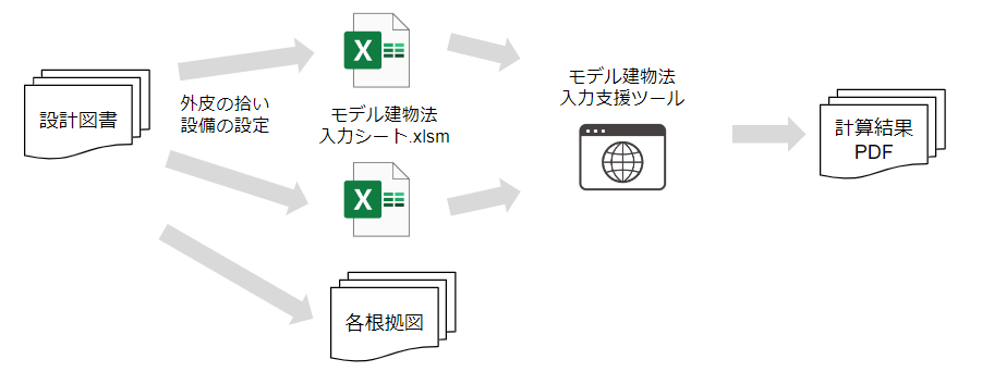 Webプログラム「モデル建物法入力支援ツール」を使用した計算では、設計図書の情報をもとに建物用途ごとにExcel入力シートを作成し、WEBプログラムにアップデートする必要があります。