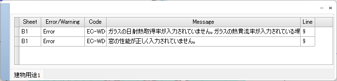 一覧の各行の分類(Sheet)と行番号(Line)を確認して、問題となった部分を特定することができます。この例では「B1」開口部仕様の「9」行目に問題があるという通知になります。