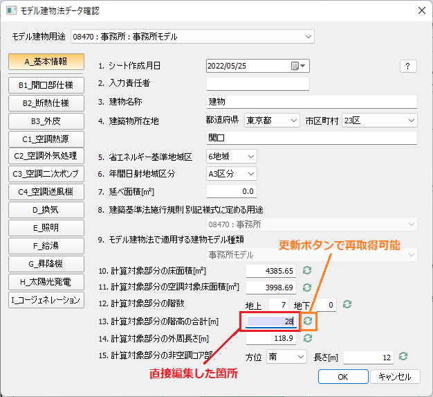 「データ確認」コマンドで計算に使用したデータの確認や、「基本情報(様式A)」の編集を行うことができます。「基本情報」で直接編集した値は入力欄の背景が青になります。更新ボタンをクリックすることでモデルから値を再計算して取得することもできます。