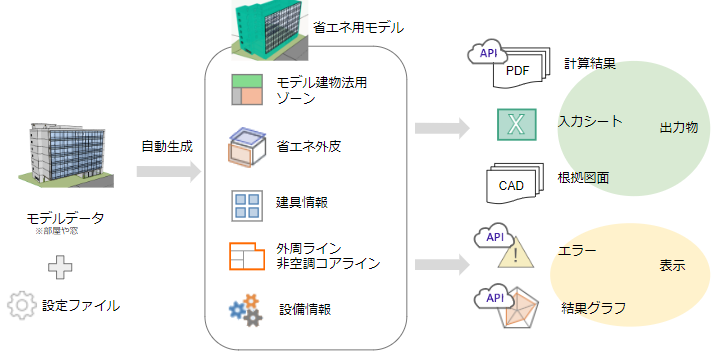 i-ARMでは既存のモデルから、省エネ用モデルを自動生成し、そこから入力シート用のデータを作成します。また、計算にはWebAPIを使用することでWebプログラムに入力シートをアップロードすることなく計算を行うことができます。複数用途の際にも、複数用の集計ツールを使用する必要がなくなり、作業の効率化を図ります。また、ハードルが高いと感じている人でも、省エネ申請の理解を深めながら使用していただけるように、流れにそって設定すると計算まで簡単に行えるような機能となっています。各種根拠図の出力にも対応しています。