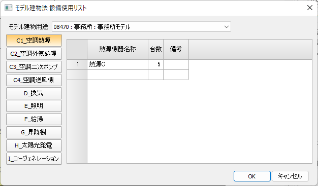 設備使用リスト:モデルで実際に使用している設備機器の追加・削除・編集を行います。