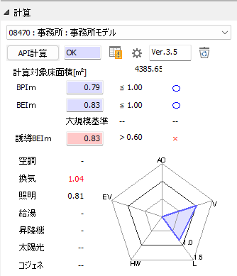 計算結果は、省エネモデル建物法のシートダイアログの「計算」で確認できます。結果を確認し、編集が必要な箇所は編集を行っていきます。