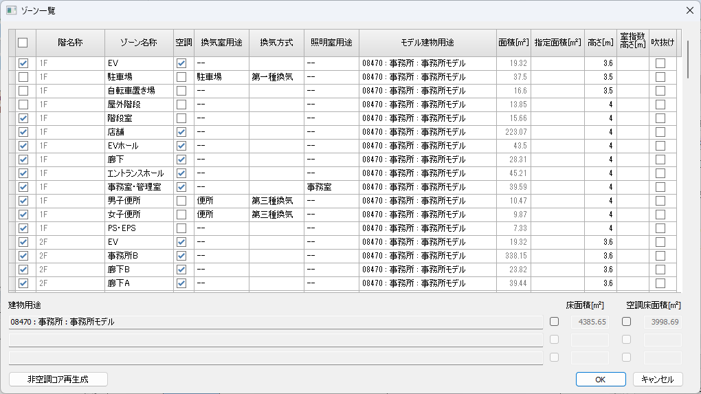 計算対象やモデル建物用途、空調/非空調を変更した際には、「非空調コア再生成」ボタンからゾーンの属性をもとに外周ラインや非空調コアラインを再算出することも可能です。