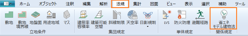 モデル建物法を計算したいデータを開き、法規タブの「省エネモデル建物法」コマンドを実行します。