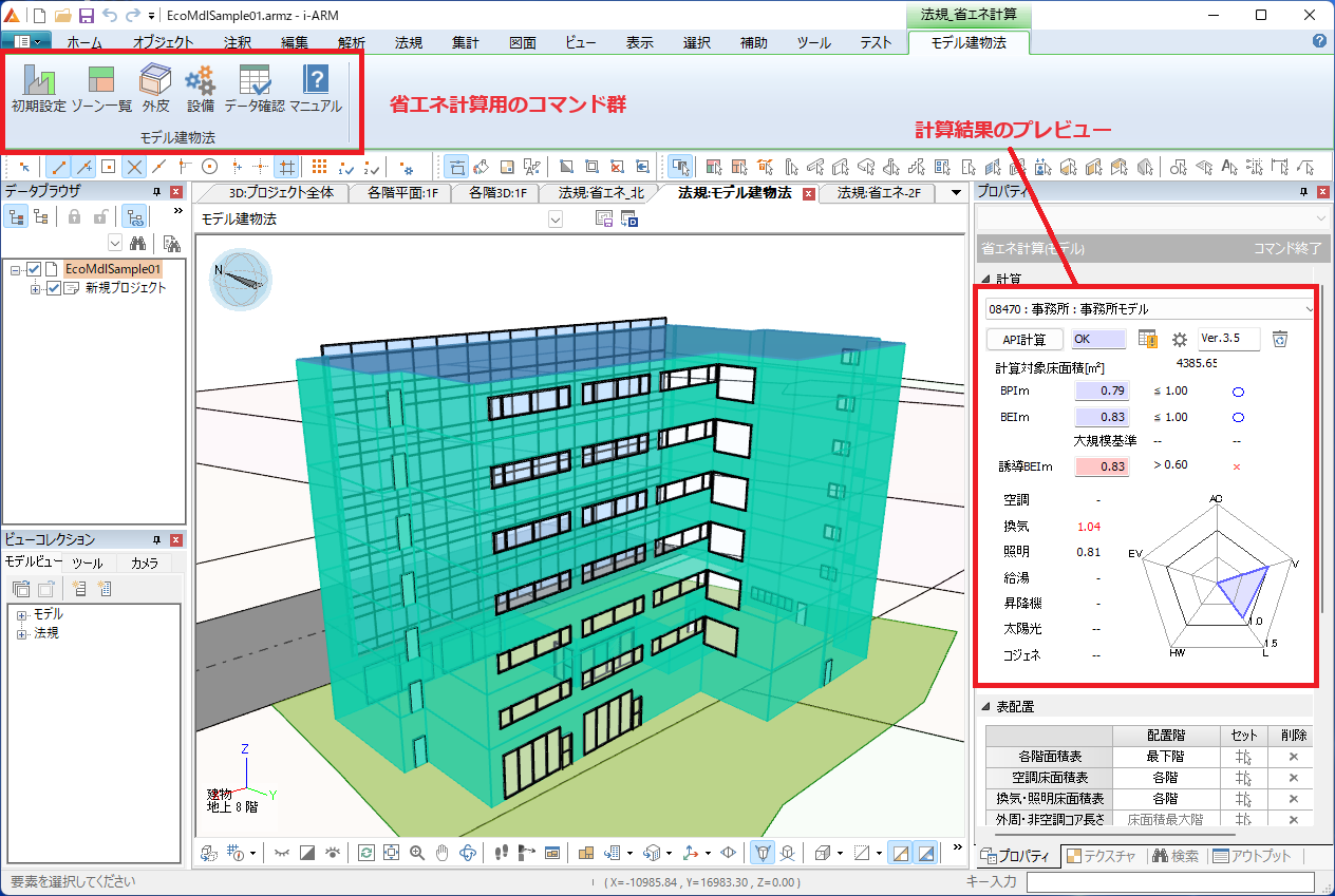 省エネ計算用のコマンドがリボンメニューに並んでおり、計算結果はシートダイアログに表示されます。