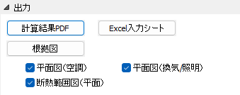 「平面図(空調)」「平面図(換気/照明)」「断熱範囲図(平面)」のうちチェックを入れたものを図面出力します。 |