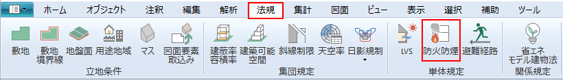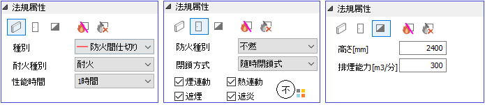 壁や建具に法規属性の追加や機械排煙時の排煙口の入力を行います。