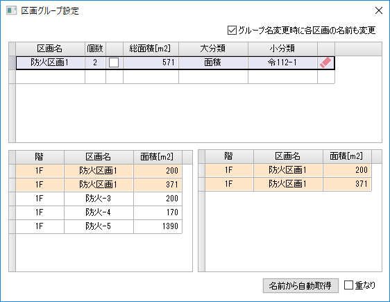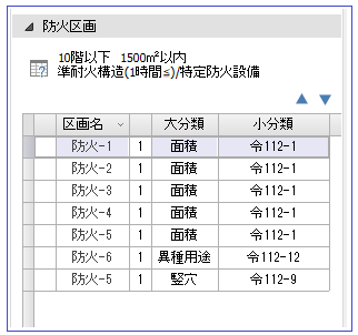 入力されている防火防煙区画をリスト表示し、区画の選択や区画種別の変更を行います。また、出力ボタンで図面出力を行います。