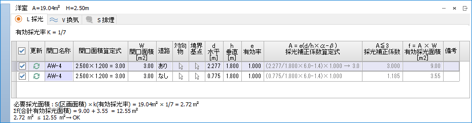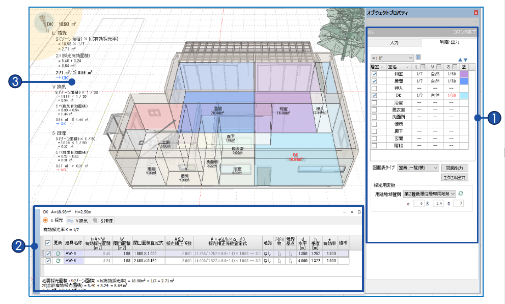 居室(入居者が継続して居住したり、作業や集会をおこなう室)の採光・換気・排煙の確認を行います。用途地域や部屋、壁、建具の情報から居室の床面積に対して有効な開口率が確保できているかを判定します。