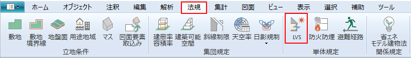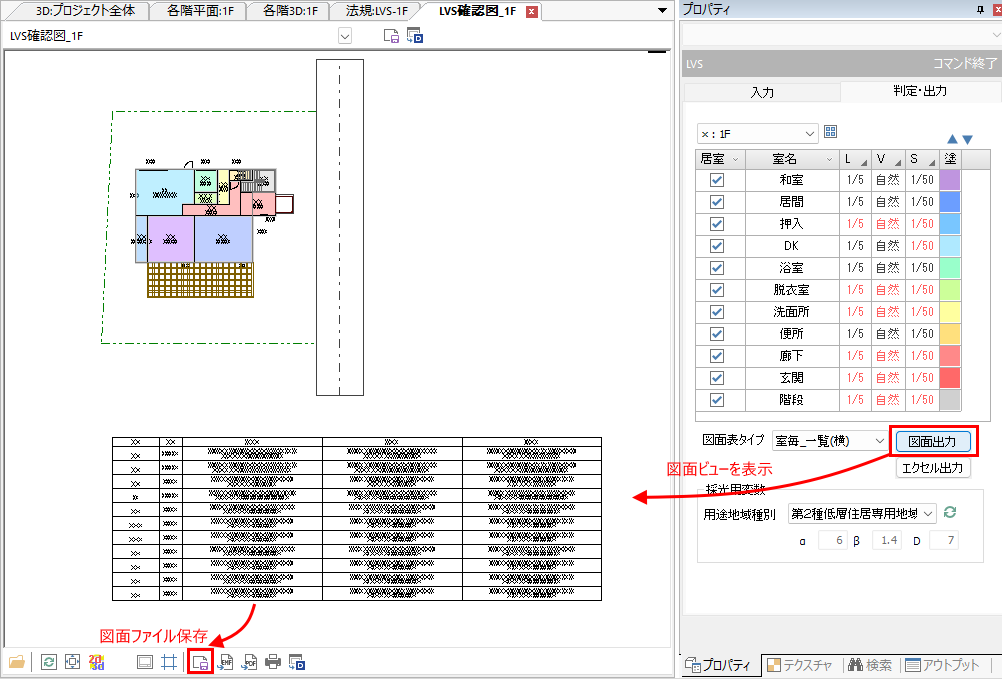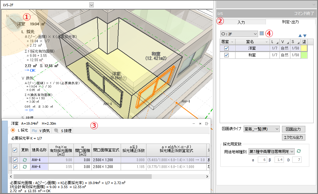 (1)階切り替え LVS判定を行う階を切り替えます。 (2)LVSゾーングリッド 指定階のLVSゾーン一覧を示します。室名の変更やLVSそれぞれの計算種別、塗色の変更が可能です。 (3)図面出力 「図面出力」「エクセル出力」を行います。図面出力の表タイプが選択可能です。 (4)採光用変数 採光用の変数として、用途地域を設定します。更新ボタンからモデルから用途地域を取得します。 |
