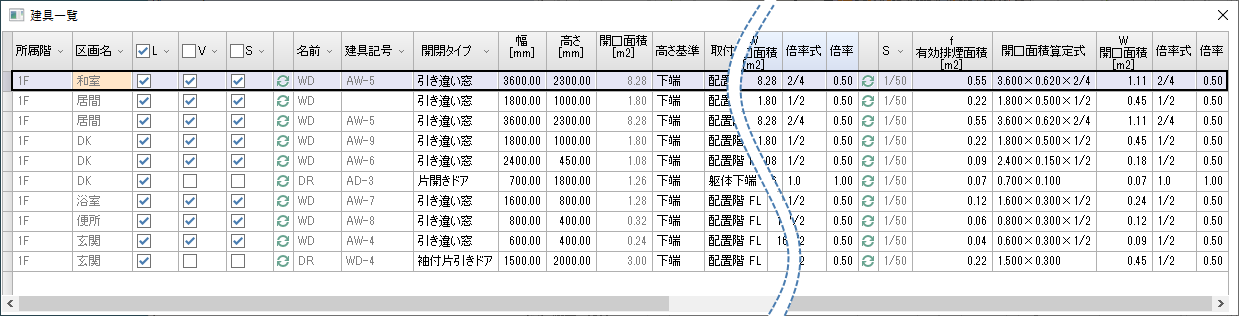 建具の基本情報や採光・換気・排煙の各設定値を確認・編集することができます。