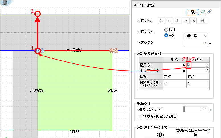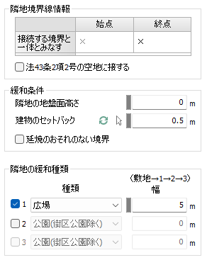 境界線種別が隣地の場合[隣地の緩和種類]、道路の場合[道路奥側の緩和種類]の数を設定します。