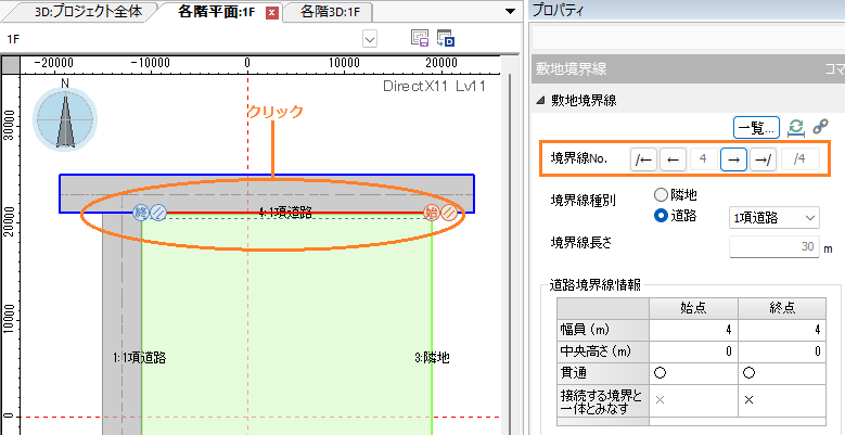 隣地や道路などの境界線種別、セットバック設定、緩和条件設定など、敷地境界線の諸条件を設定します。