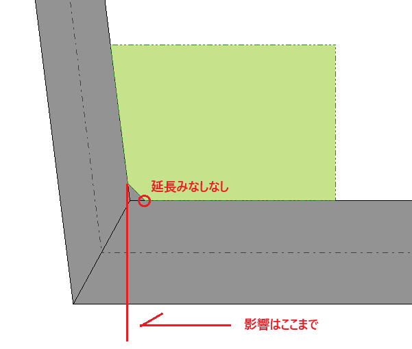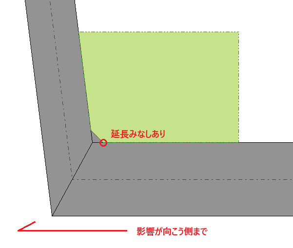 隅切り端部で接続する道路を隅切りより向こう側にも延長しているものと見做すか設定します。
