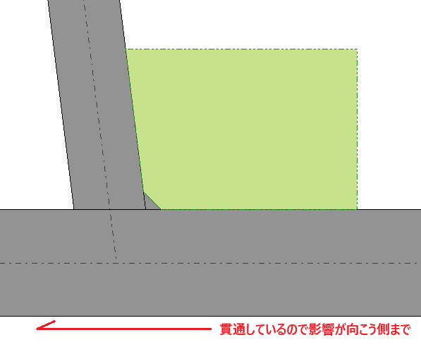 通常は、接続する道路の「貫通」設定で、貫通の指定がない場合は隅切り端部で接続する道路の影響が途切れるものと見做して処理しますが、影響が続くものとする場合に設定します。