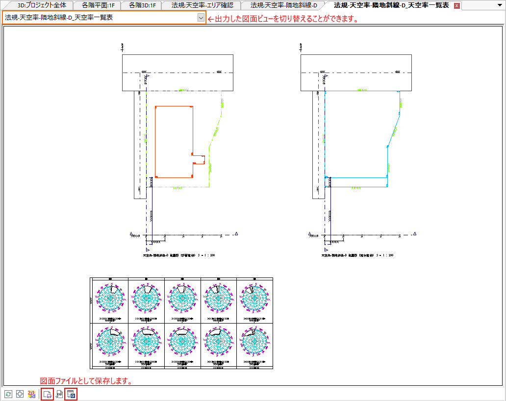 選択した斜線制限(エリア)に関する配置図・立面図・天空率一覧表・三斜求積図を自動作成します。