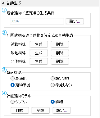 適合建物/天空率算定点の自動生成に関する条件について設定を行えます。