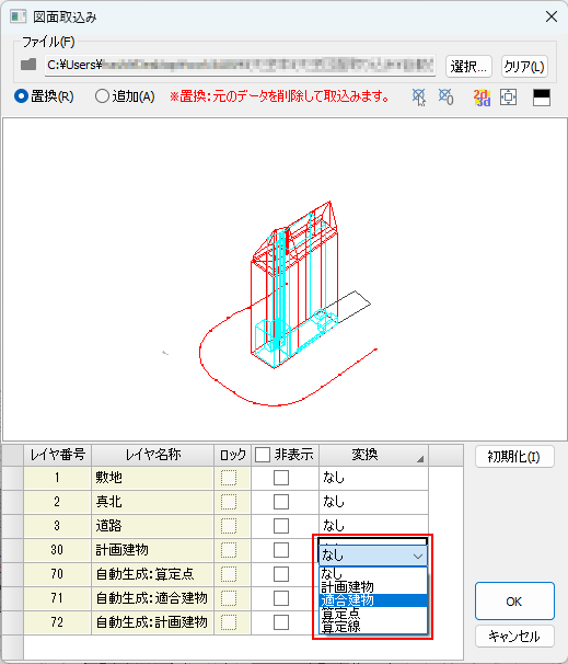 置換:既存のデータ(計画建物、適合建物、算定点)を破棄して、読み込みます。