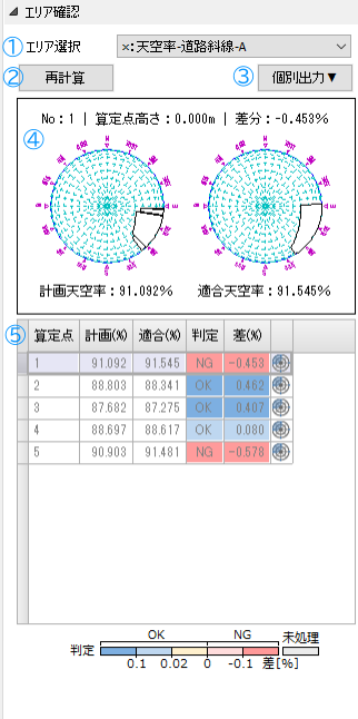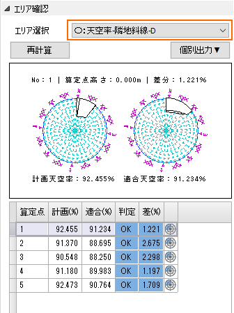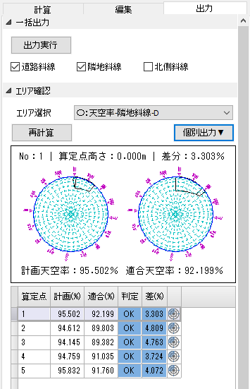 各算定点の天空率と判定結果を表示します。