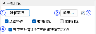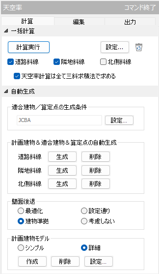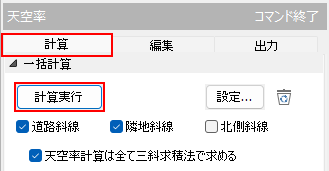 注)この機能には自動生成処理が含まれます。各エリアで行った手動での編集内容を維持したまま天空率計算を行いたい場合には、「編集タブ」または「出力タブ」にある「再計算」を使用してください。