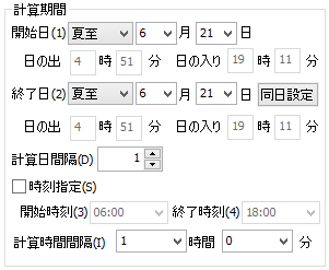 ※時刻指定をしない場合、開始日から終了日の間で、最も早い「日の出時刻」が計算開始時刻となり、最も遅い「日の入り」時刻が計算終了時刻となります。