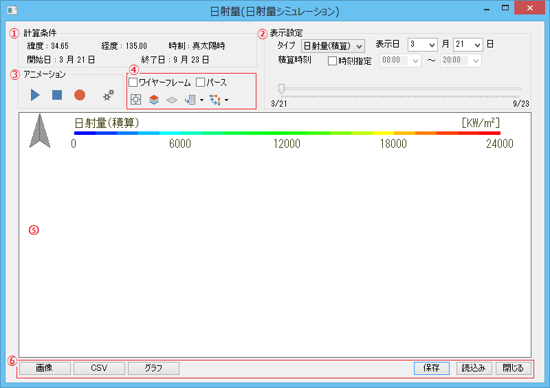 スライダー位置を変更することで表示日(日射量積算)又は、表示時刻(日射量)を変更することができます。
