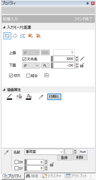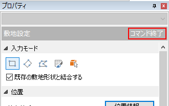 入力や編集などの多くのコマンドでは、プロパティウィンドウ内がコマンド用のパラメータを設定するコントロールに切り替わって表示されます。