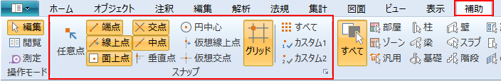 スナップモードは、リボンメニュー→[補助]、または、スナップツールバーの各ボタンのクリックで選択できます。(Ctrl+クリックで単一選択)