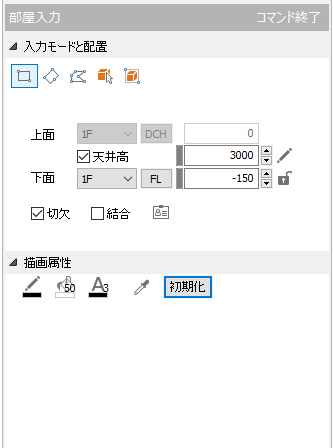 入力コマンドはダイアログで、入力の形状の選択「入力モード」や配置位置、各パラメータ、描画属性の設定を行い、ビュー上に入力していきます。配置位置の設定で、オブジェクトの所属階が決まり、3D入力時には、スナップした位置から所属階が自動で割り振られることもあります。