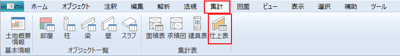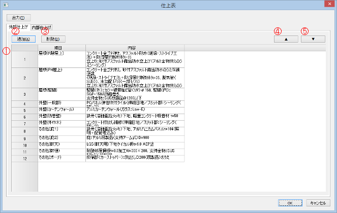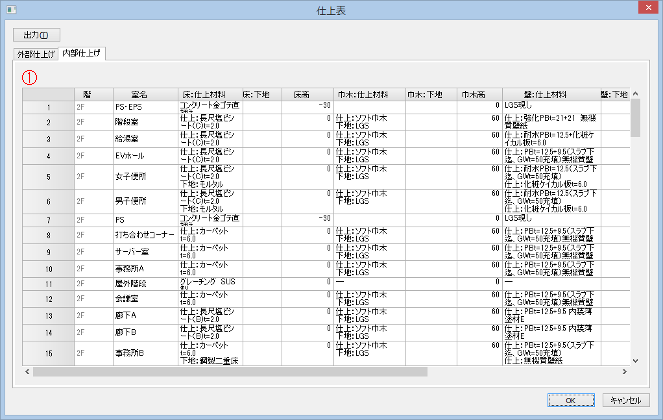 建物の外部仕上や各部屋の内部仕上を一覧表示します。