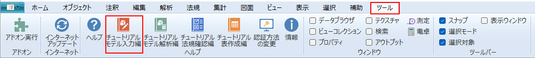 リボンメニュー[ツール]→[チュートリアルモデル入力編]